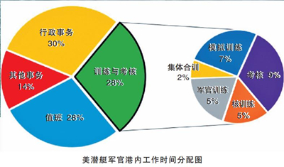 据悉,美军潜艇回港后,每名军官每周要抽出至少1天时间担任作战值班员。在港口内,要保证至少29%的军官处于值班状态,其间没有任何学习和训练的可能。即使处于非值班状态,军官们也还有大量日常工作需要完成,比如处理文书、管理士兵、协调与港口关系等。军官和士兵还要随时准备完成其他任务,比如健康宣传、福利计算、出海费用审核等。另外,美军每艘潜艇要定期派出1名军官和若干士兵前往潜水学校,接受为期6周的离艇训练,其间无法进行任何与潜艇作战相关的训练。