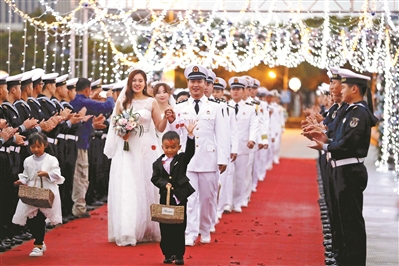 十一月十八日,东部战区海军某驱逐舰支队在东海某军港隆重举行 “大海作证、军舰为媒”集体婚礼。在战友的见证下,二十六名因任务推迟结婚的支队官兵与爱人一起走进婚姻的殿堂。图为新人们携手步入婚礼现场。方思航摄