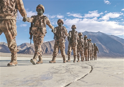 近日,因连续降雪,西藏阿里地区气温已降至零下28摄氏度。1月4日,阿里军分区某边防连巡逻分队,按计划对海拔4300多米的某执勤点进行巡逻。图为巡逻分队官兵手拉手通过冰面向点位前行。刘晓东摄