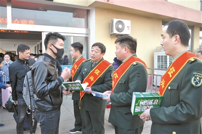 春运高峰期,为扎实做好征兵宣传工作,山东省曹县人武部组织干部职工深入城区中学、火车站、大型超市、集贸市场等人员密集场所集中开展征兵宣传活动,营造“参军报国光荣、国防建设人人有责”的浓厚社会氛围。图为人武部干部职工在火车站发放征兵宣传手册。 赵鲁亚摄
