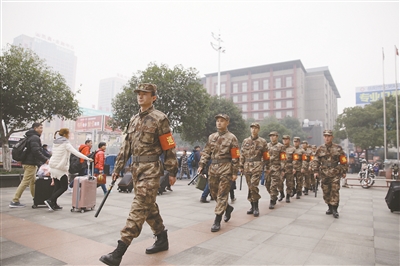 为做好节后返程的安全稳定工作,近日,湖南省岳阳市岳阳楼区人武部组织民兵应急连在辖区内商业中心、火车站等人流量大的场所周边开展维稳巡逻行动。图为应急分队在商业中心进行巡逻。吴 维摄