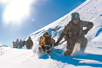 2月13日,新疆塔城军分区某边防团雀干托盖边防连巡逻官兵乘骑战马,冒着-30℃的低温,在茫茫雪海中巡逻勘察祖国的边防线。王 越摄