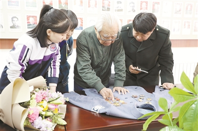 干休所有啥明星?肖辛格说:“抗战英雄吕品就是我们要追的‘星’!”原来2月9日,肖辛格在收看《感动沈阳十大人物》 颁奖晚会时,被96岁抗战老兵吕品的事迹深深感动。“吕爷爷是了不起的英雄,我一定要见见他,当面表达敬意。”肖辛格的想法,引起同学赵彬彧的共鸣。二人在家人的帮助下,找到干休所。征得吕品同意后,他们手捧鲜花来“追星”。图为吕品对肖辛格(左一)、赵彬彧(左二)讲述军功章背后的故事。
