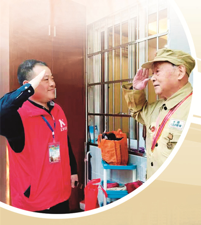 图①:志愿军老兵曹仁义与大“合影”组织者薛余华互敬军礼。