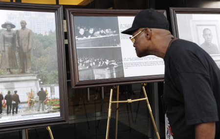 9月4日,在美国首都华盛顿唐人街,一位居民观看“纪念辛亥革命一百周年图片展”。华盛顿唐人街当日人头涌动,来自哥伦比亚特区、马里兰州、弗吉尼亚州等附近地区华人欢聚一堂,共庆辛亥革命一百周年,观看“纪念辛亥革命一百周年图片展”。新华社记者 张军 摄