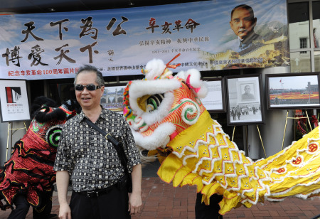9月4日,在美国首都华盛顿唐人街,一名参观者在“纪念辛亥革命一百周年图片展”前留影。华盛顿唐人街当日人头涌动,来自哥伦比亚特区、马里兰州、弗吉尼亚州等附近地区华人欢聚一堂,共庆辛亥革命一百周年,观看“纪念辛亥革命一百周年图片展”。新华社记者 张军 摄