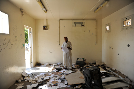9月18日,在利比亚首都的黎波里的阿齐齐亚兵营,一名男子在房屋内查看被丢弃的文件。如今,每天都有很多当地居民来到阿齐齐亚兵营参观,一睹曾经神秘的卡扎菲权力中心。新华社记者李木子摄