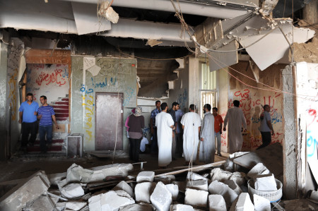 9月18日,在利比亚首都的黎波里的阿齐齐亚兵营,人们在一座建筑内参观。如今,每天都有很多当地居民来到阿齐齐亚兵营参观,一睹曾经神秘的卡扎菲权力中心。新华社记者李木子摄