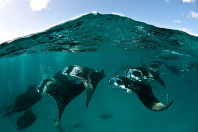 英国摄影师沃伦-巴维斯托克用了9天时间,在马尔代夫海底拍摄壮观的魔鬼鱼(又名:蝠鲼)集体觅食景象。照片中,身躯庞大的蝠鲼好似巨大的蝙蝠一样在水中游动,它们聚集在一起,享用浮游生物。