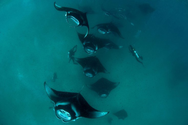 英国摄影师沃伦-巴维斯托克用了9天时间,在马尔代夫海底拍摄壮观的魔鬼鱼(又名:蝠鲼)集体觅食景象。照片中,身躯庞大的蝠鲼好似巨大的蝙蝠一样在水中游动,它们聚集在一起,享用浮游生物。