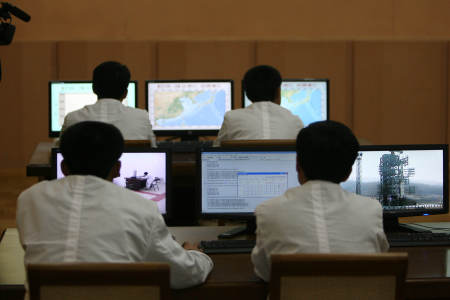 4月8日,工作人员在位于朝鲜平安北道铁山郡东昌里的“西海卫星发射场”综合指挥所内的监控中心工作。朝鲜当日安排外国记者到位于平安北道铁山郡东昌里的“西海卫星发射场”参观卫星发射综合指挥所和“光明星3号”卫星发射塔。新华社记者张利摄