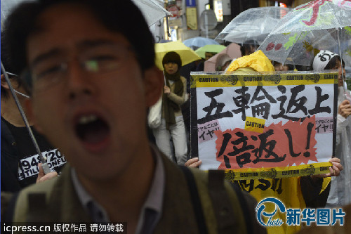 当地时间2013年10月20日,日本东京涩谷地区,民众冒雨游行,抗议东京将举办2020年夏季奥运会。据悉,约80%的民众认为日本政府当前首要的任务是2011年大地震的灾后重建工作。图片来源:东方IC 版权作品 请勿转载