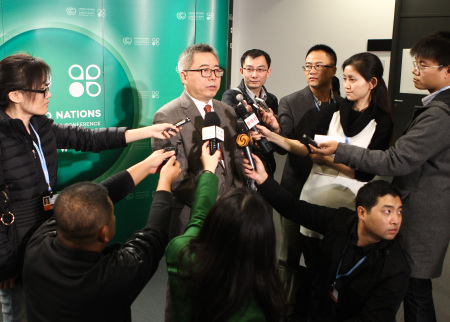 11月11日,在波兰华沙,中国代表团副团长苏伟(中)接受采访。