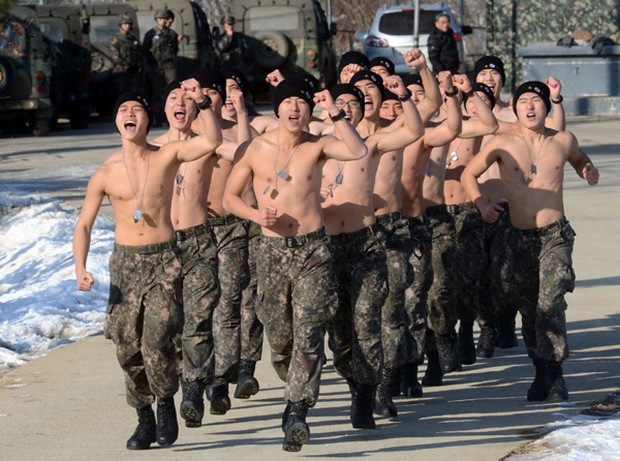 据韩国《中央日报》12月24日报道,当地时间2013年12月23日,江原道华川郡陆军第七师所属GOP(地面观察所)大队的官兵在严冬的寒冷中,迎着刺骨的寒风,裸上身进行冬季训练。报道称,由于当前朝鲜半岛局势升温,身处前哨位置的韩军警戒部队正在加强警戒态势。