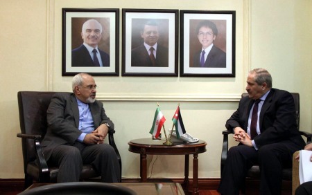 1月14日,约旦外交大臣朱达(右)在首都安曼会见到访的伊朗外长扎里夫。