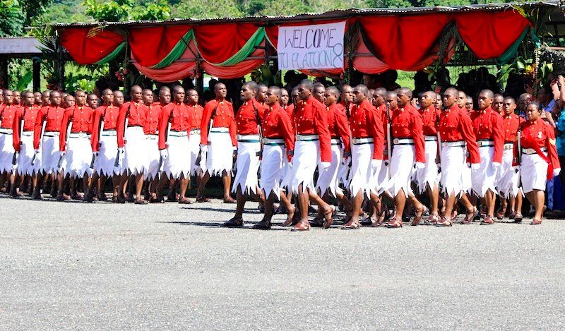 斐济军队阅兵军装奇葩:红色长袖上衣、白色花边长裙配皮凉鞋。