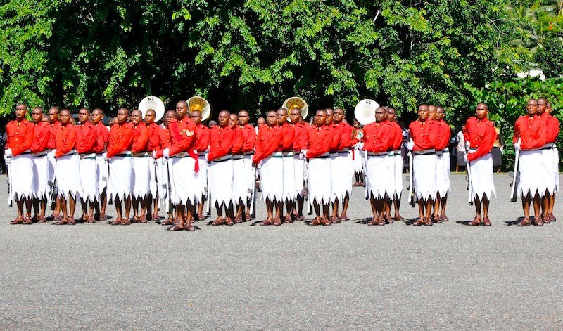 斐济军队阅兵军装奇葩:红色长袖上衣、白色花边长裙配皮凉鞋。