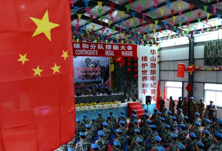 当日,中国第十六批赴刚果民主共和国(刚果(金))执行维和任务的工兵分队和医疗分队军人在刚果(金)南基伍省省会布卡武接授联合国颁发的维和勋章。