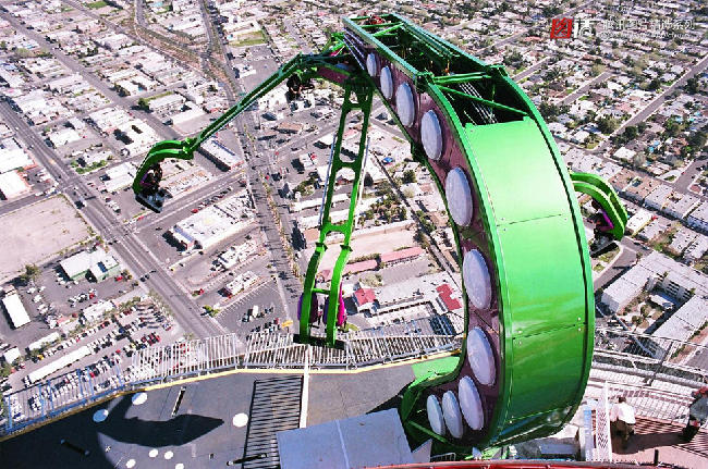“疯狂转轮”采用类似旋转八爪鱼游戏的设计,建造在塔顶边缘,游玩者在游戏过程中会有一部分时间是悬空于离地面274米的高空。