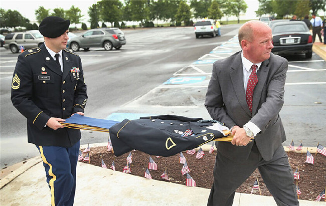 美军陆军军士丹·威尔逊(Dan Wilson)与殡仪馆馆长埃德·希基(Dan Wilson)抬着陆军一等兵Aaron Toppen的制服。该制服于2014年6月23日在Mokena的Parkview基督教堂展出。