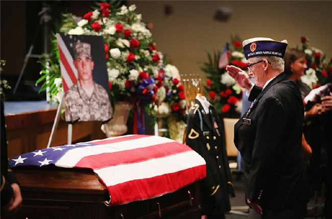 一名老兵前来瞻仰Aaron Toppen的遗骸,他对Toppen行军礼,向其致敬。