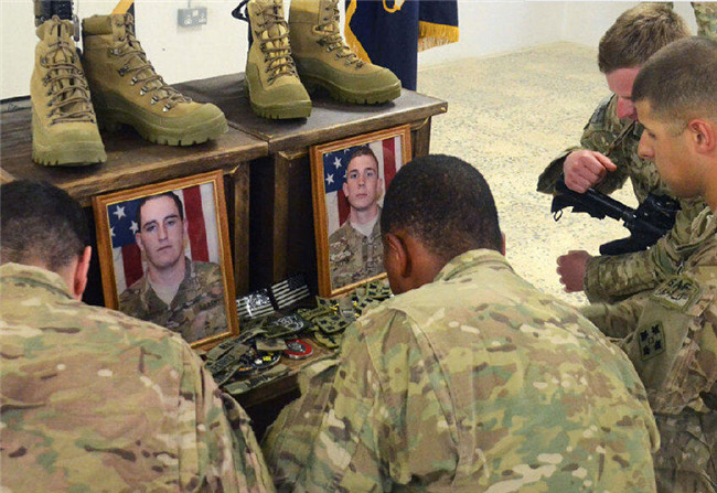 6月13日,美军士兵在查布尔省的前方基地为牺牲的士兵献上最后的敬意,贾斯丁下士(Cpl. Justin )和一等兵亚伦(Aaron Toppen)在6月10日的战斗中死亡。