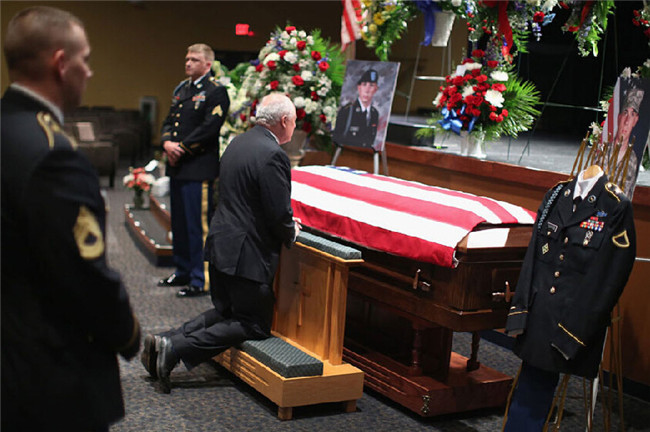 伊利诺斯州州长帕特·奎因( Pat Quinn)向Aaron Toppen的遗骸致敬。