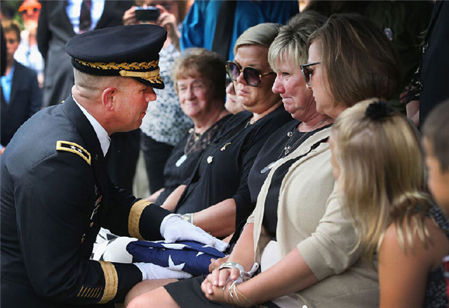 美国陆军少将杰夫·斯诺(Jeff Snow)将国旗交给Pamela Toppen(遇难士兵Aaron Toppen的母亲)。
