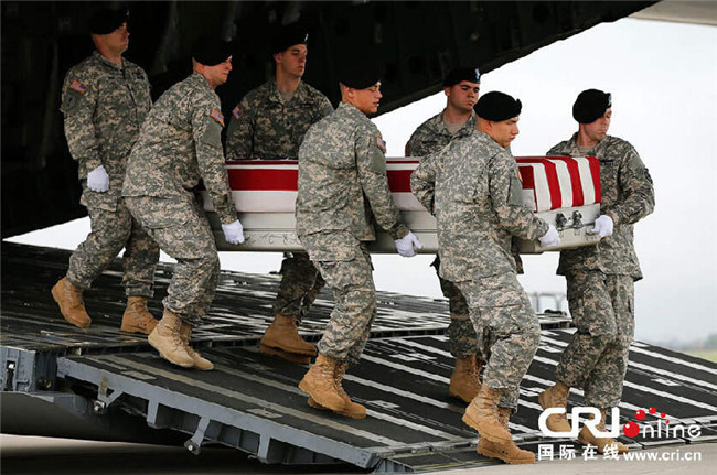 当地时间2014年6月12日,美国特拉华州的多佛空军基地,士兵们正在运送遇难陆军一等兵Aaron Toppen的遗骸。图片来源:Win McNamee/GettyNorthAmerica/CFP