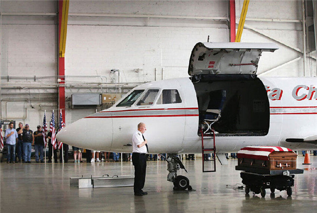 2014年6月21日,芝加哥中途机场,Aaron Toppen的灵柩从飞机上抬下,准备运输到他的家乡。一名机组人员面朝灵柩,向这位年轻的遇难士兵致敬。