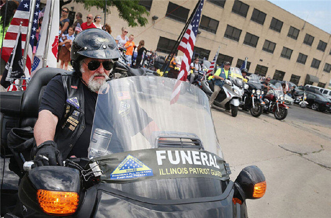 当地时间2014年6月21日,芝加哥中途机场,一名爱国者卫队骑手正等待着护送遇难士兵Aaron Toppen回家。