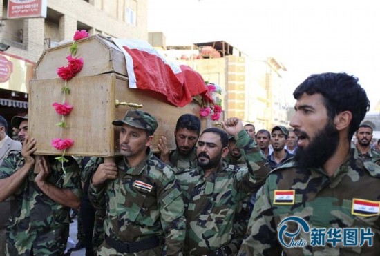 当地时间2014年7月6日,伊拉克纳贾夫,加入伊拉克军队对抗伊斯兰激进组织的什叶派遇难志愿者葬礼举行。