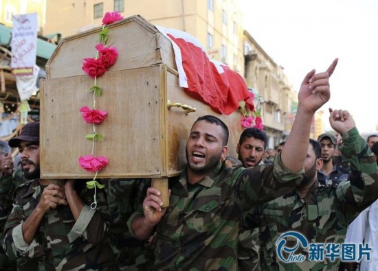 当地时间2014年7月6日,伊拉克纳贾夫,加入伊拉克军队对抗伊斯兰激进组织的什叶派遇难志愿者葬礼举行。