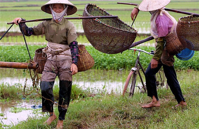 2009年的统计数据显示,越南农村人口仍然占到70%以上。由于经常发展滞后,大量富余人口滞留在农村,生活清贫,男尊女卑的思想也非常严重。图为2001年7月,河内附近的农村,两名女子在稻田里捕鱼。