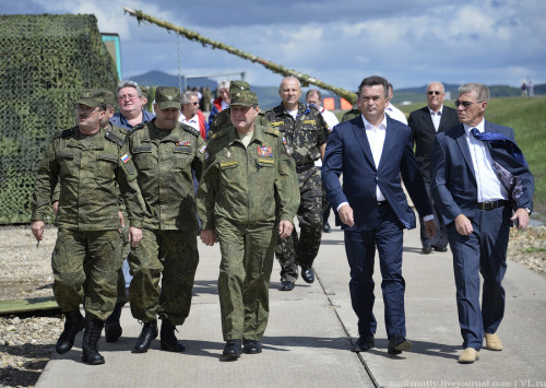 俄军方高官观看演习。