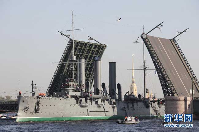 9月21日,俄罗斯圣彼得堡涅瓦河上的桥打开,以便“阿芙乐尔”号巡洋舰在拖船的牵引下进厂维修。
