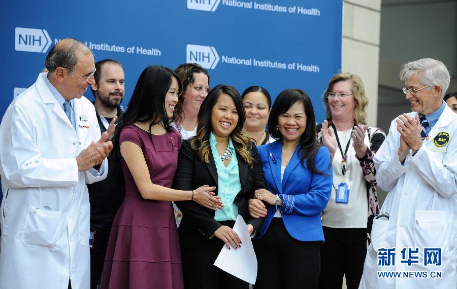 10月24日,在美国国家卫生研究院临床研究中心,护士尼娜·范(前排左二)出席新闻发布会。新华社记者 鲍丹丹 摄