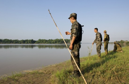 近日的演习科目中,参演士兵学习了如何在丛林、湖泊地带获取食物。图为解放军士兵在学习钓鱼。