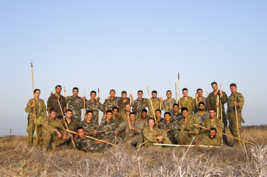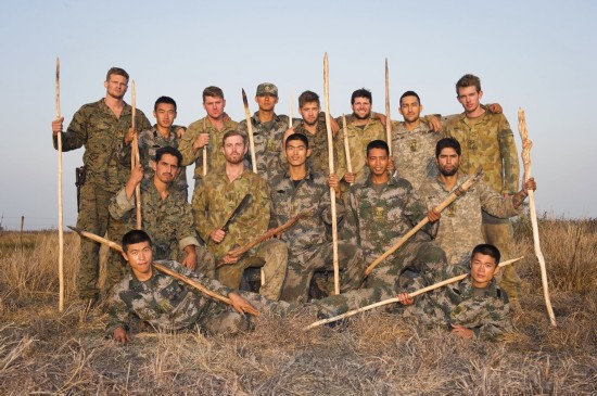 近日的演习科目中,参演士兵学习了如何在丛林、湖泊地带获取食物。图为参演士兵手持鱼叉合影。