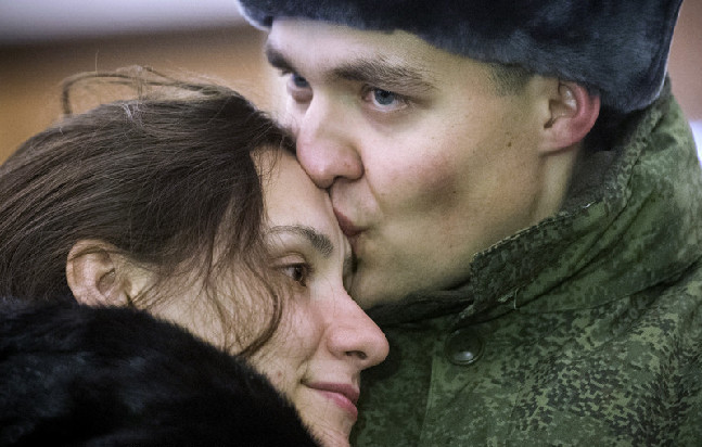 当地时间2014年11月14日,俄罗斯新西伯利亚,俄罗斯中央军区的应征士兵在欢送仪式上拥抱一名女孩,吻别女孩后,士兵参加新营地的训练。