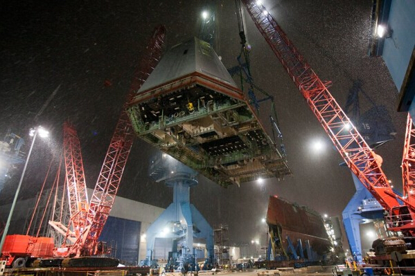 1000吨的上层建筑由4台起重机吊运,与610英尺长的船体进行集成。上层建筑在亨廷顿英戈尔斯工业公司建造,并与7月交付海军,然后运至缅因州与船体整合。