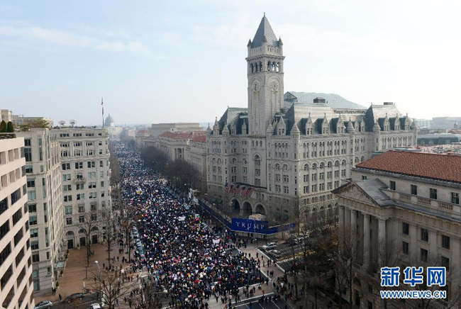 12月13日,在美国首都华盛顿的宾夕法尼亚大街,人们参加抗议游行。当日,近万名示威者在华盛顿举行集会和游行,抗议暴力执法和种族歧视。弗格森案和纽约白人警察扼杀黑人案件近期在美国掀起抗议浪潮。新华社记者 殷博古 摄