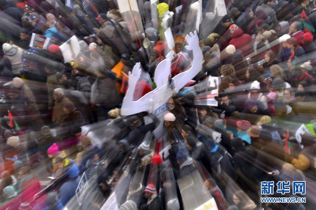 12月13日,在美国首都华盛顿的宾夕法尼亚大街,人们参加游行示威。当日,近万名示威者在华盛顿举行集会和游行,抗议暴力执法和种族歧视。弗格森案和纽约白人警察扼杀黑人案件近期在美国掀起抗议浪潮。新华社记者 殷博古 摄