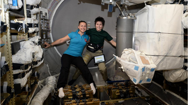 俄罗斯航天员叶莲娜·谢罗娃(左)和欧洲航天局宇航员萨曼莎·克里斯托弗雷蒂(右)搭档工作,亲密无间。(网站截图)