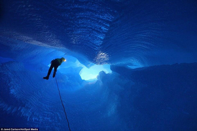 两位大胆的美国探险家来到阿拉斯加州门登霍尔冰川,从一条一人宽的冰缝中垂降到1600多米深的地方,并且在冰层深处呆了八个小时,然后再慢慢从深渊底部爬到冰层表面。途中他们留下了这些令人叹为观止的照片:原来冰川核心是一片深沉的蔚蓝,挂在冰面上的人就像在海里游的鱼和天上飞的鸟。