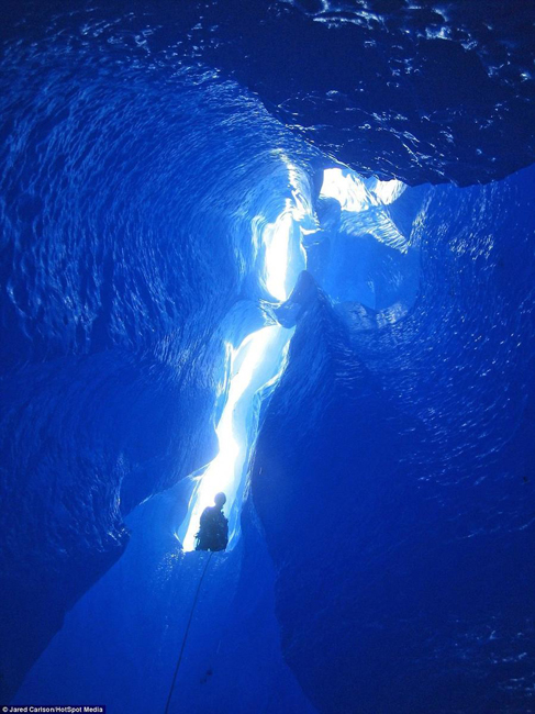 冰川的美丽掩盖了它的危险。两名探险者花了八个小时才垂降到冰缝底部,距离冰川表面1600多米。