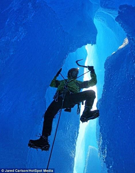 身处冰川内部的洞穴,探险者仿佛走进外星世界。