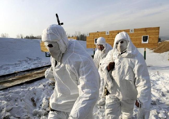当地时间2011年2月22日,俄罗斯士兵穿着雪地伪装服参加射击训练。