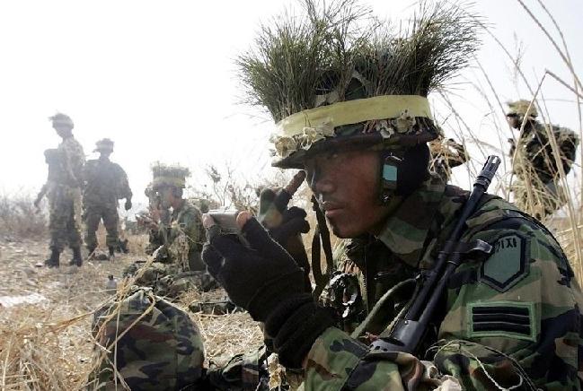 当地时间2007年3月16日,韩国Yeoju,一名士兵头上戴着草参加模拟朝鲜袭击的军事演习。