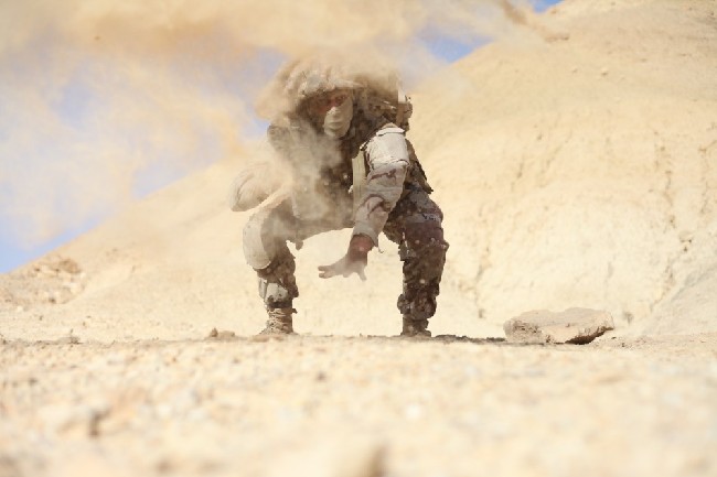 以色列整个国家都位于沙漠地带。因此,其军队训练多在沙漠内进行。这种环境下,伪装是必须要练的,而且还要练精。图为一名以军士兵身着与地表颜色相似的伪装服进行潜伏训练。